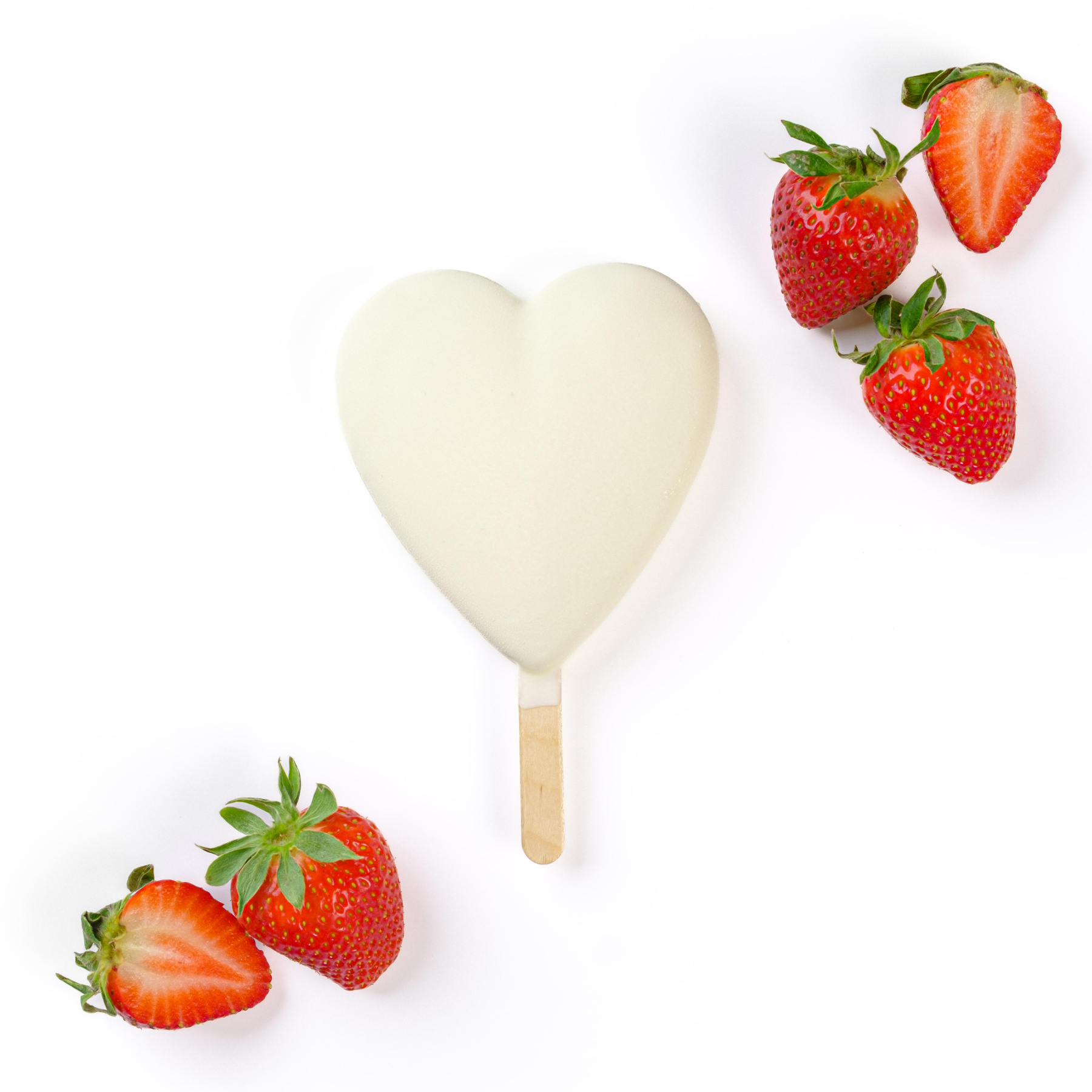 Полуничне морозиво на паличці в білому шоколаді у формі серця. Фірмове натуральне морозиво. Бельгійський шоколад Callebaut.
