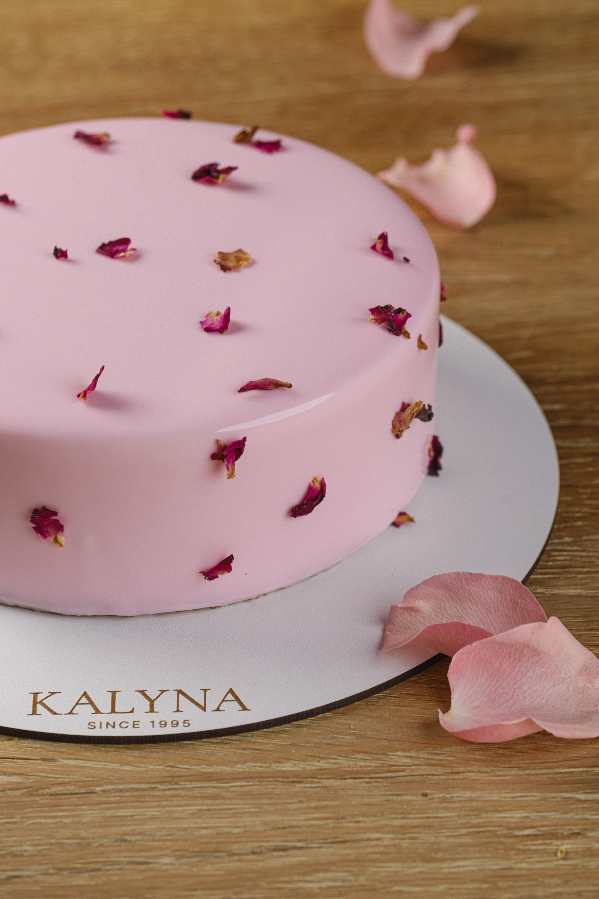 Миндальный бисквит, клубничный мусс, клубничное желе, ванильный мусс на белом шоколаде. Покрыт розовой глазурью и украшен лепестками роз.