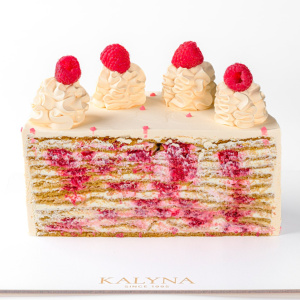 Тонкие мёдовые коржи с прослойками сливочно-сметанного крема с ягодами малины. Торт покрыт крем-чизом и украшен свежей малиной.
