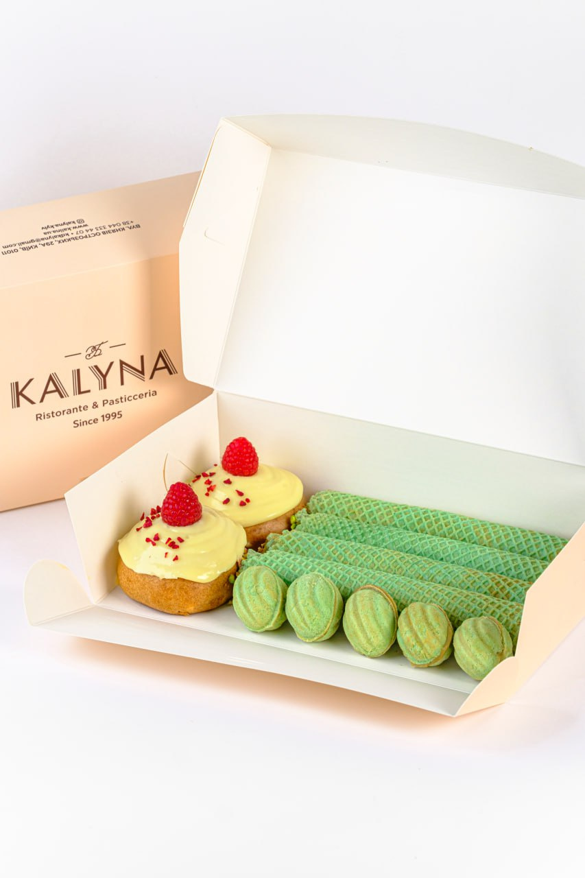 Набор состоит из профитролей с заварным кремом, покрытых белым ганашем, украшенных свежей малиной и сублимированной малиной; хрустящих вафельных трубочек с фисташковым кремом; песочных орешков с фисташковым ганашем.