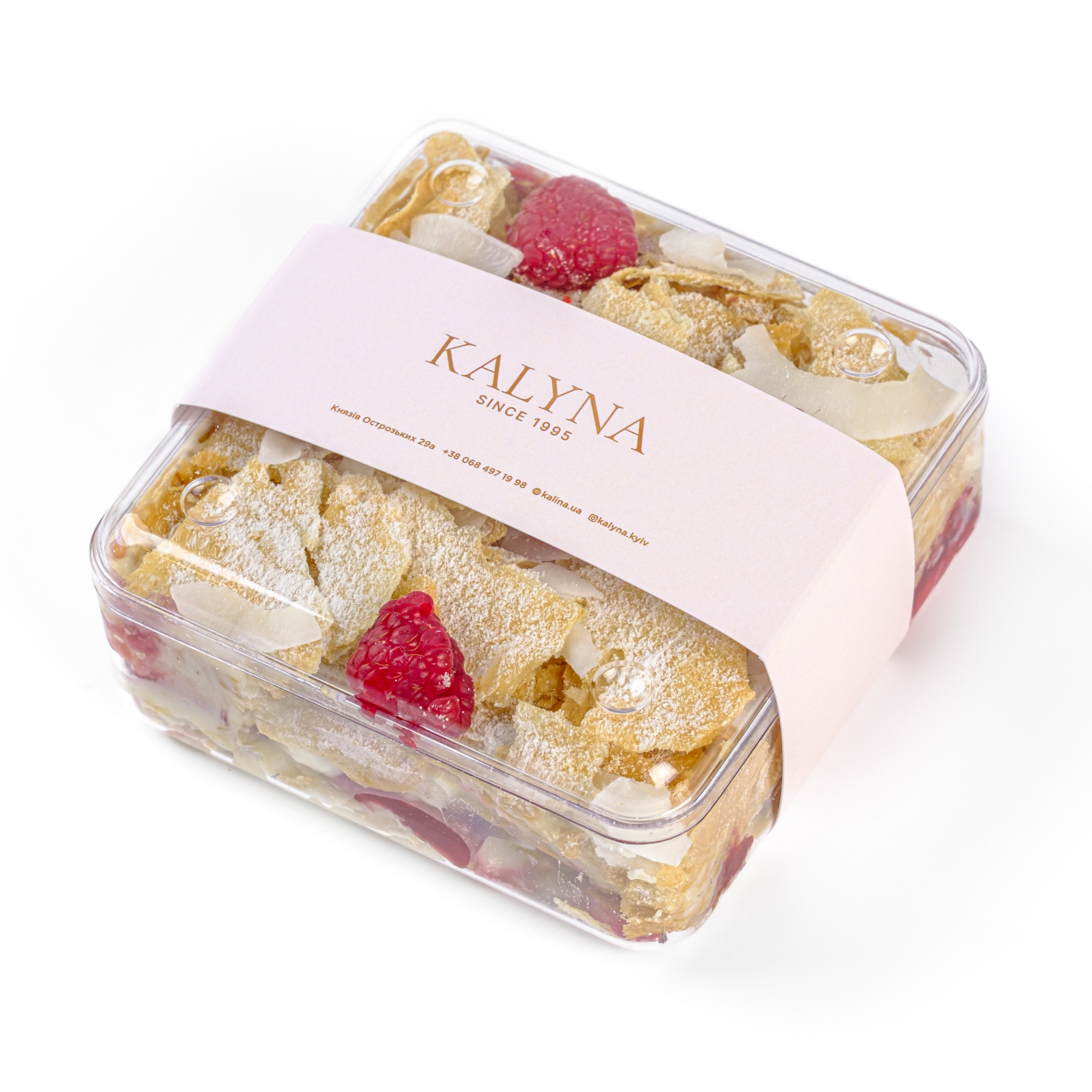 Хрустящие тонкие лепешки с нежным кремом на кокосовых сливках с добавлением малинового кюля. Украшен тонкими, хрустящими слайсами кокоса и свежей малиной.