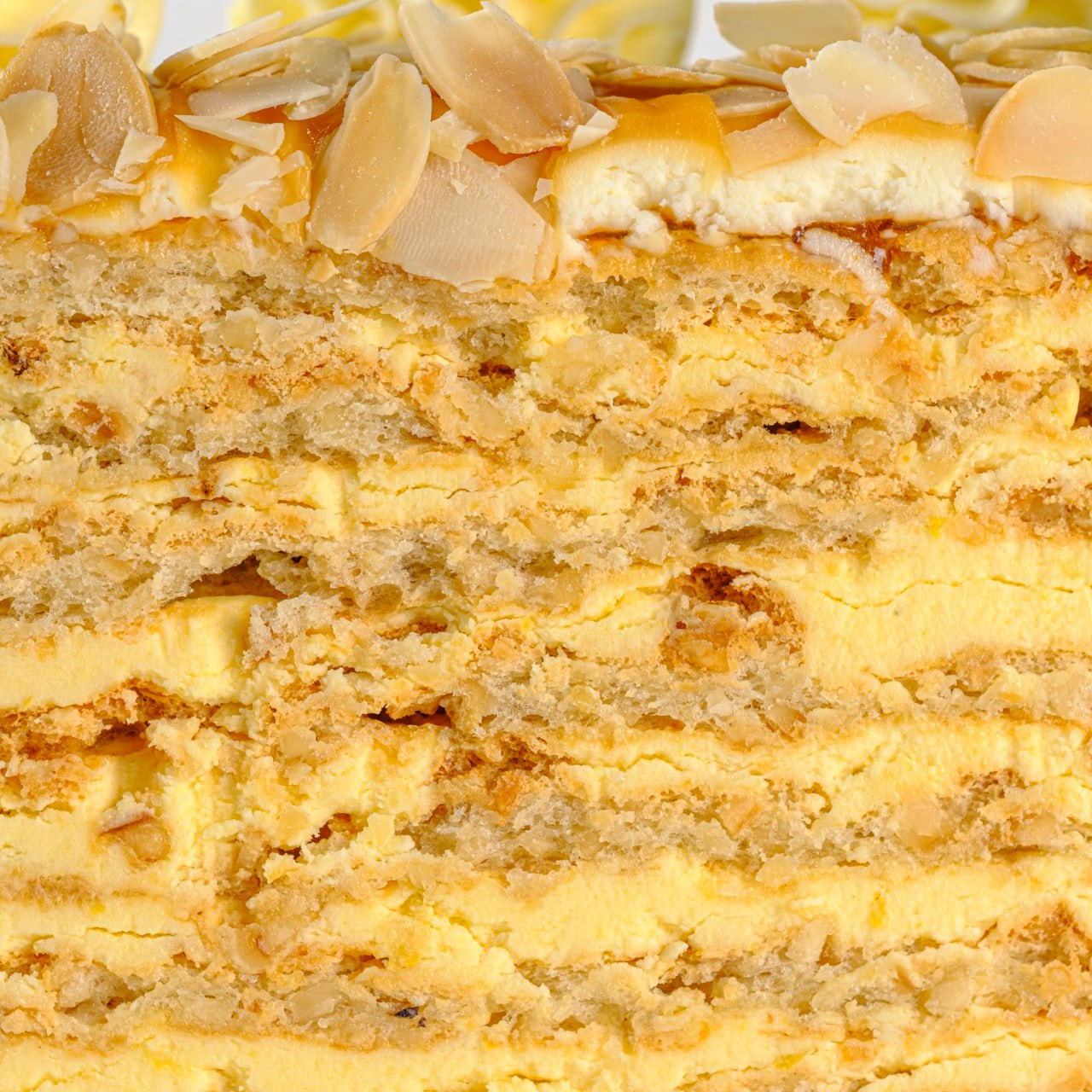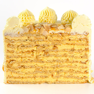 Тонкие ореховые лепешки чередуются с масляно-заварными кремовыми прослоями, верх пропитан абрикосовым джемом. Торт покрыт крем чизом, украшен ганашем соленая карамель и жареными миглальными хлопьями.