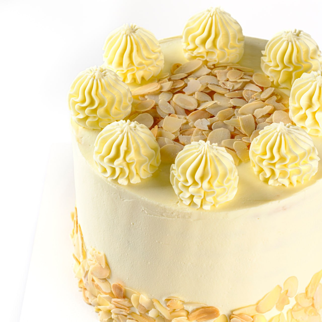 Яйца, сахар, фундук, мука пшеничная, соль, молоко, масло сливочное 82%, ванилин, ликер фруктовый, крем сыр, сахарная пудра, миндальные хлопья, сливки животные
