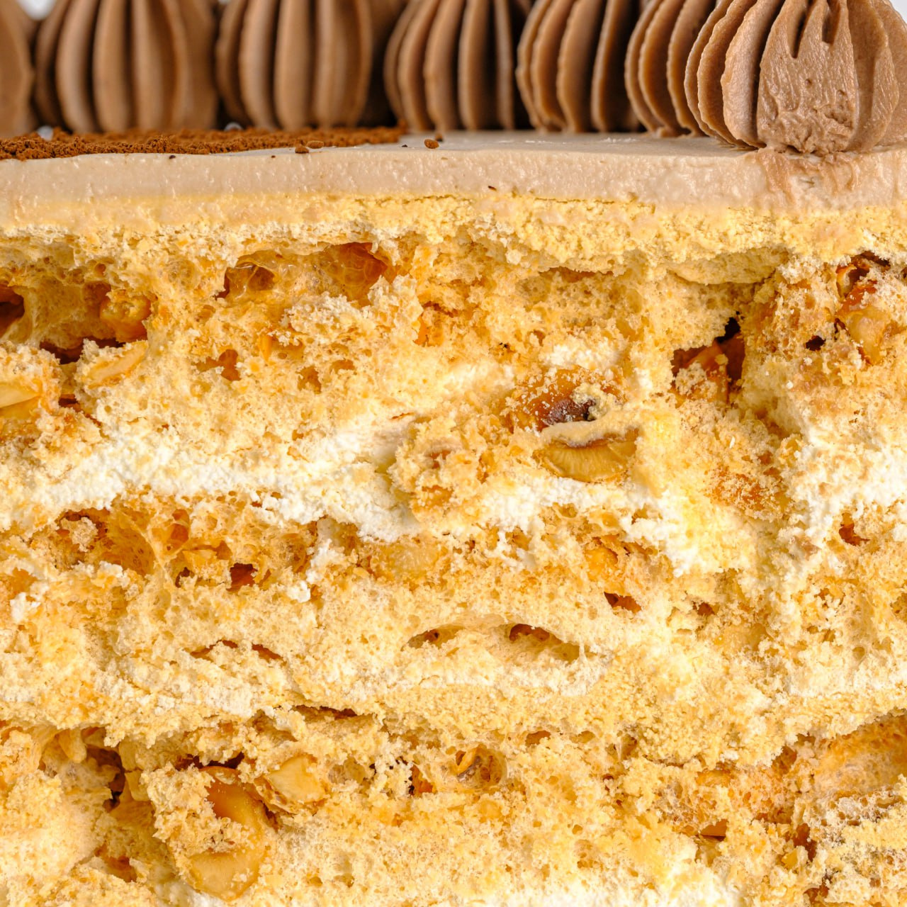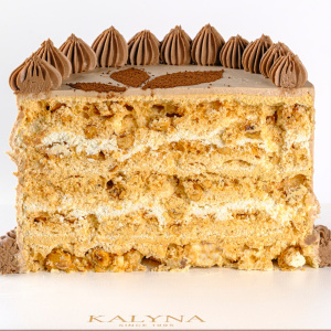 Нежные хрустящие лепешки с добавлением жареного измельченного ореха фундук с двумя прослоями крема, белково-масляный заварной крем и масляный крем на сгущенном молоке. Укрыт крем чизом, украшен какао в виде каштанового листа.