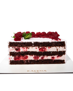 Пропитанный малиновым конфи, с прослойкой безлактозного сливочно-малинового крема с ягодами малины. Покрыт растительными сливками. Украшен малиново-желейным декором в виде короны из ягод малины.