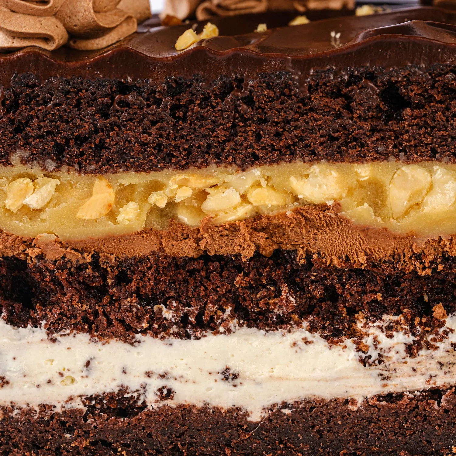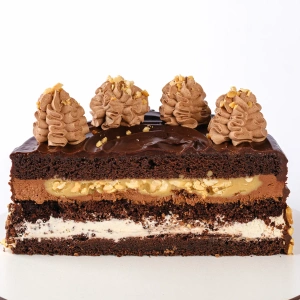 Шоколадно-масляный безглютеновый бисквит, с прослойками творожным-заварным безлактозным кремом, шоколадным ганашем, соленой карамелью на основе эритрита с добавлением жареного соленого арахиса.