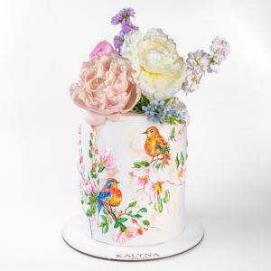 Украшен художественными элементами, созданными непосредственно на поверхности торта и живыми цветами.
