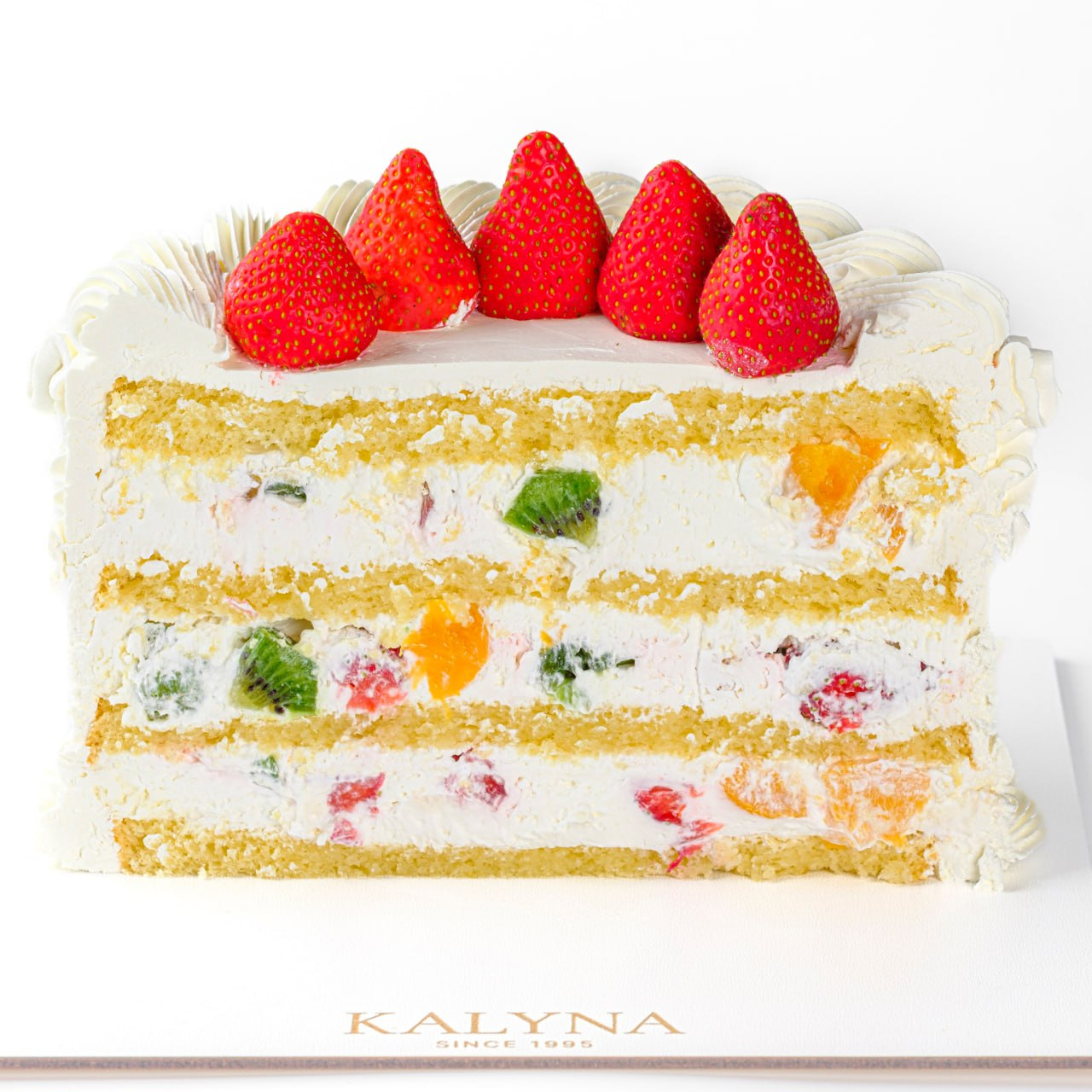 Нежнейший классический бисквит, пропитанный фруктовым сиропом, взбитые воздушные сливки с кусочками фруктов (ассорти: свежая клубника, персик, киви). Покрыт крем-чизом и украшен свежей клубникой.
